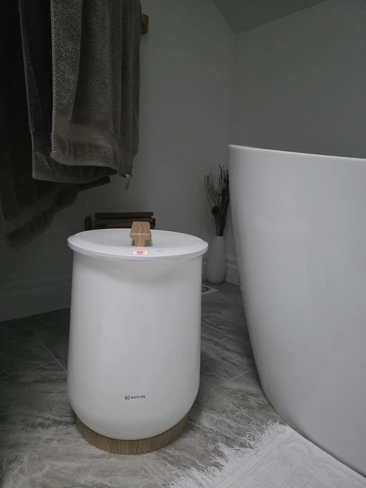 Warm towels in minutes with 360° even heat, soft, fresh, and safe in a sleek white-and-wood design with one-touch controls and auto shut-off.